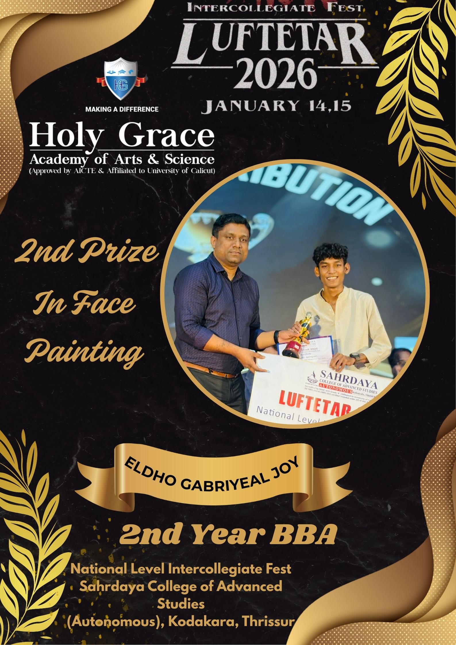 2nd Prize in Face Painting - Eldho Gabriyeal Joy at Luftetar Intercollegiate Fest in 15-01-26