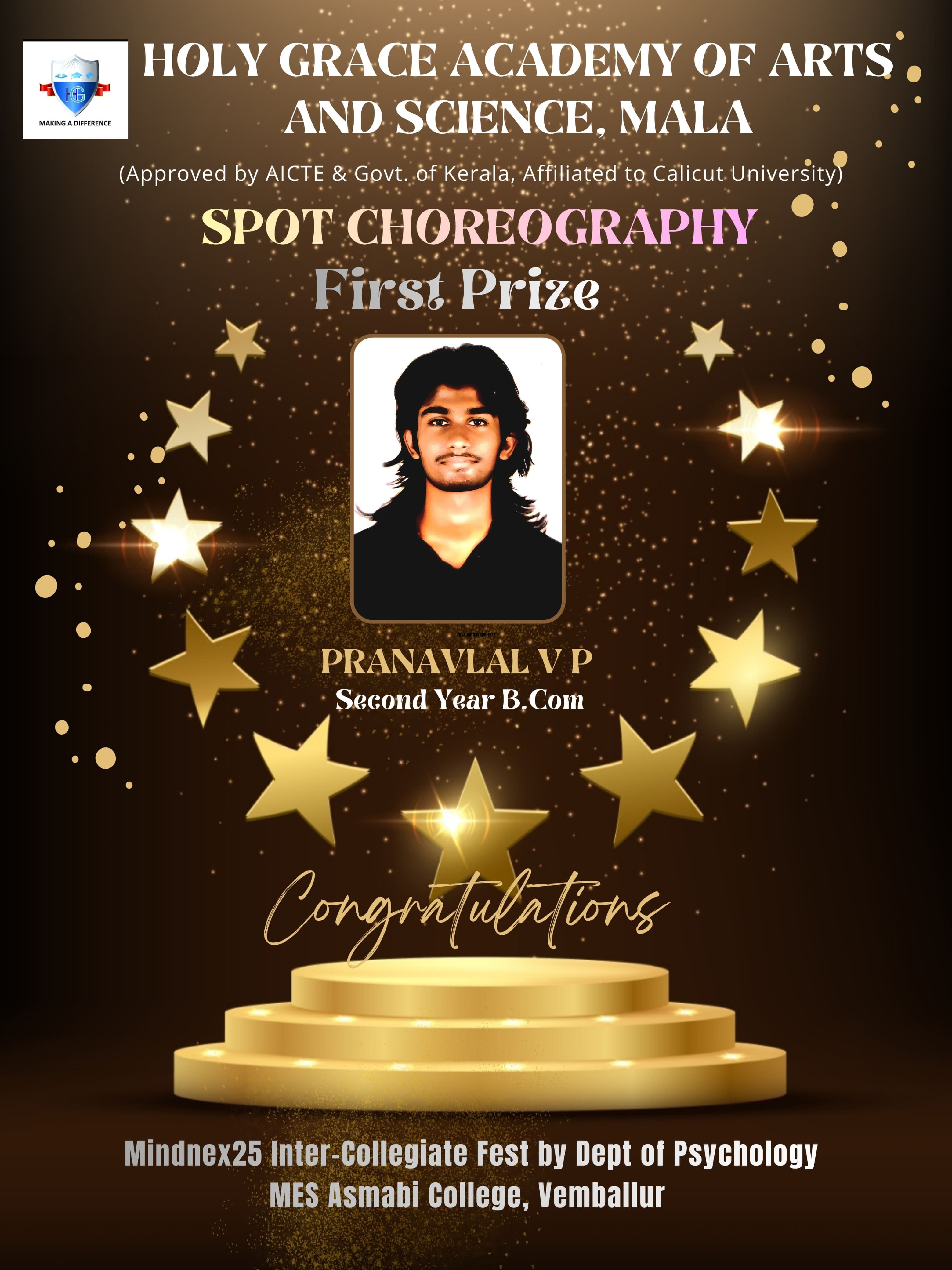 Pranavlal V P - First Prize in Spot Choreography in Intercollegiate Fest at Mes Asmabi College Vemballur